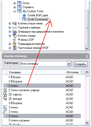 В панели "Список команд" перетащите команду, которую необходимо разместить под именем подменю в панели "Настройки в <имя файла>".